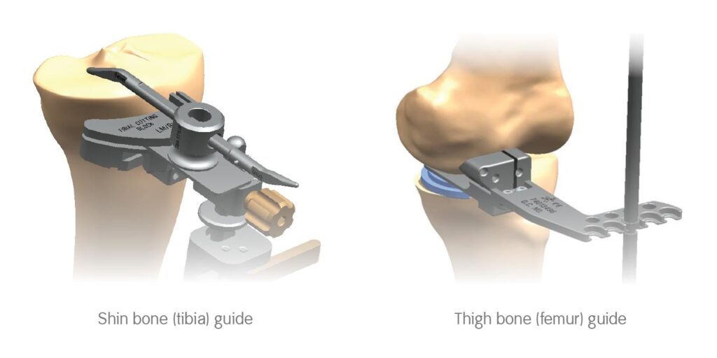 Using traditional surgical methods, cutting blocks or guides are placed on the thigh bone (femur) and shin bone (tibia) to help direct a surgical saw in removing the diseased bone and cartilage. This method has been considered technically challenging, as accurately placing these blocks can be difficult. In recent years, advanced surgical techniques using robotic assistance have been developed to provide a higher level of accuracy and precision.